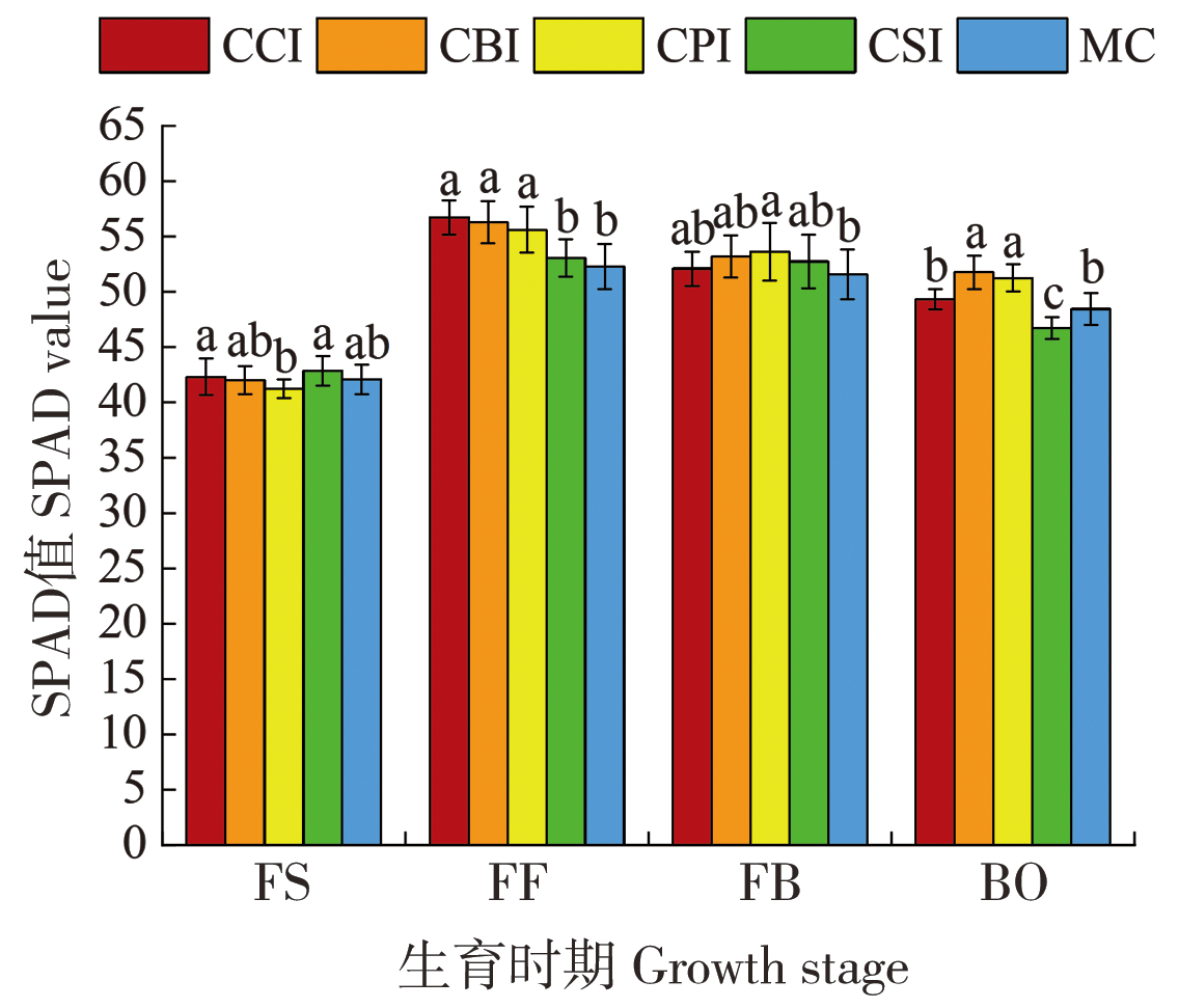 | 吐絮期 | CCI | 63.28±2.50 a | 60.21±2.96 ab | 169.49±1.17 a | 292.98±6.29 a |
