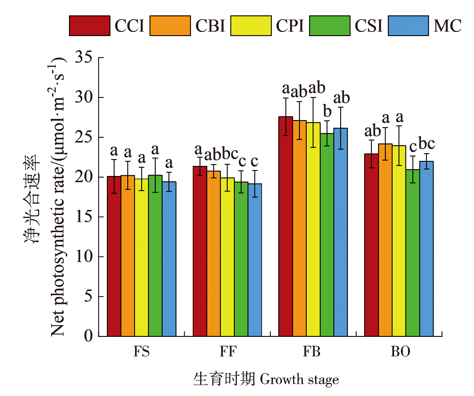 | 盛花期 | CCI | 25.36±1.03 ab | 30.49±1.65 ab | 8.01±1.02 bc | 63.85±3.69 b |