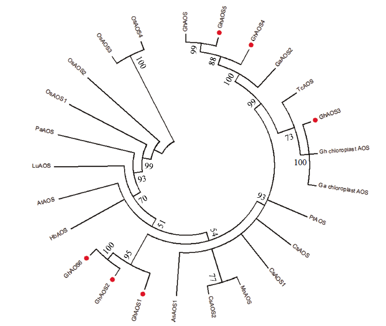 将预测出的6个AOS基因所编码的氨基酸序列与在NCBI中比对到不同物种的19个AOS氨基酸序列进行多重序列比对,构建系统进化树。根据进化树分析发现GhAOS1、GhAOS2和GhAOS6聚为一类,相似性较高,其中GhAOS2与GhAOS6的相似性为100%;而GhAOS3与陆地棉及亚洲棉叶绿体中存在的AOS相似度为100%;另外,GhAOS4与GhAOS5的相似性为88%,这两者与NCBI上能够查到的GhAOS(GenBank: ALG62633.1)序列聚为一类,GhAOS5与GhAOS相似性为99%(
