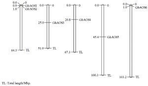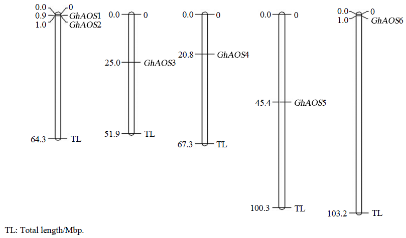 利用陆地棉AADD基因组数据库,对陆地棉AOS基因家族进行内含子和外显子分析,发现GhAOS2、GhAOS3、GhAOS4、GhAOS5都不存在内含子,CDS长度均在1500 bp左右;而GhAOS1和GhAOS6各有1个内含子,GhAOS1内含子长度为1455 bp,GhAOS6内含子长度为3223 bp。因此,从基因结构上,可将6个AOS分为2类,一类含有内含子,一类不含有内含子。染色体定位发现,6个基因被定位在5条染色体上,其中GhAOS1和GhAOS2被定位在同一条染色体上(