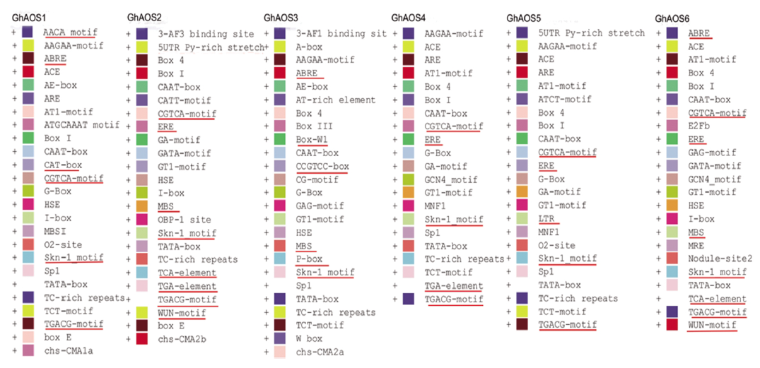 利用棉花AADD基因组数据,对这6个AOS基因的起始密码子上游的2000 bp序列分析,发现它们均具有典型核心启动子TATA盒和CAAT盒,可以确认这些序列具有调控转录功能。除GhAOS3外,另5个基因具有响应Me-JA的调控元件CGTCA基序和TGACG基序,所有的AOS启动子都含有SKn-1基序和响应激素的顺式元件,GhAOS1的启动子存在1个响应脱落酸顺式元件ABRE;GhAOS2的启动子存在与乙烯,水杨酸和生长素调节相关的元件ERE、TCA和TGA;GhAOS3的启动子存在脱落酸和赤霉素响应元件ABRE和P-box;GhAOS4和GhAOS5的启动子都存在乙烯响应元件ERE;GhAOS6的启动子存在乙烯和水杨酸响应元件ERE和TCA。除了上述调控元件外,不同基因的启动子至少含有1个胁迫响应顺式元件(ARE、HSE、TC-rich Repeats、LTR或MBS),且GhAOS2和GhAOS6都存在与伤害诱导相关的WUN基序(