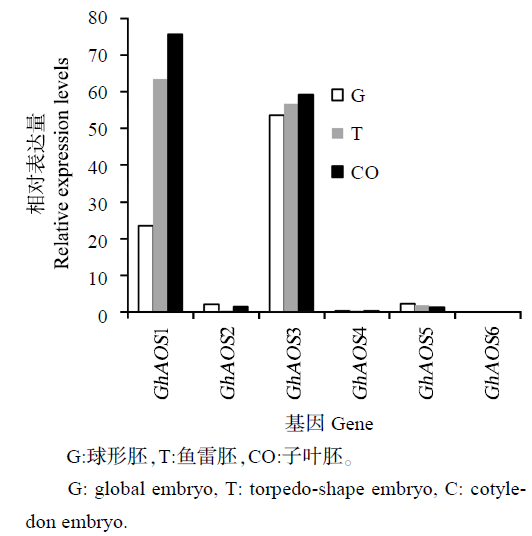 从不同组织来看,在体细胞胚再生中的表达模式大致可分为3类:GhAOS1和GhAOS6在棉花胚发育过程中表达量相对较高;GhAOS2和GhAOS3在棉花愈伤和胚性愈伤中表达量相对较高;GhAOS4和GhAOS5在茎和叶中表达水平相对较高。其中GhAOS1在体细胞胚发育过程中表达量持续升高,且表达量明显高于其他基因;GhAOS2主要在愈伤和胚性愈伤中表达,从球形胚到子叶胚的发育阶段中表达水平比较低;而GhAOS4和GhAOS5基因的表达水平随着体细胞胚的发育表现出逐渐降低的趋势,与其他组织相比较,在体细胞胚中的表达水平显著降低;GhAOS3与GhAOS6基因转录组的结果和qRT-PCR结果有一定的差异。