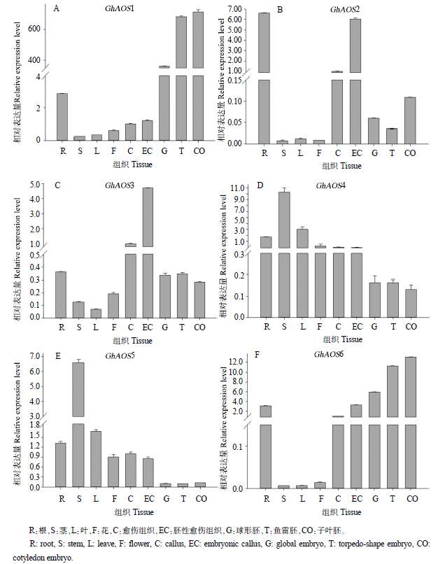 1.4.2 荧光定量qRT-PCR(Quantitative real-time PCR)。选用ABI7900仪器(美国)进行荧光定量qRT-PCR,分析鉴定出的陆地棉AOS基因家族成员在根、茎、叶、花、愈伤组织、胚性愈伤组织、球形胚、鱼雷胚、子叶胚中的表达情况,以GhHistone 3为内参基因,所用引物见